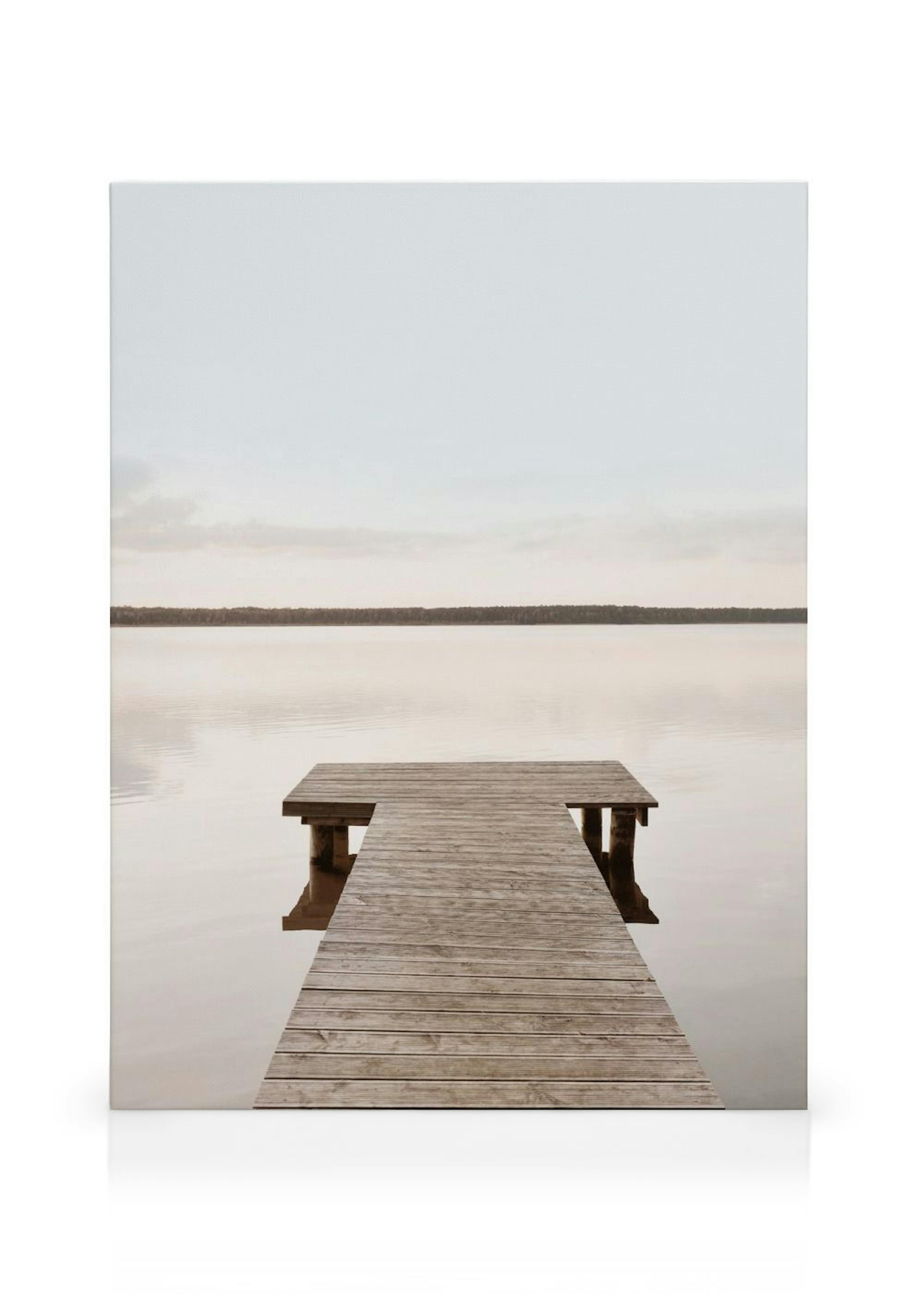 A calm canvas print of a wooden dock in a lake under a blue sky. This beige canvas will bring peace to any room.