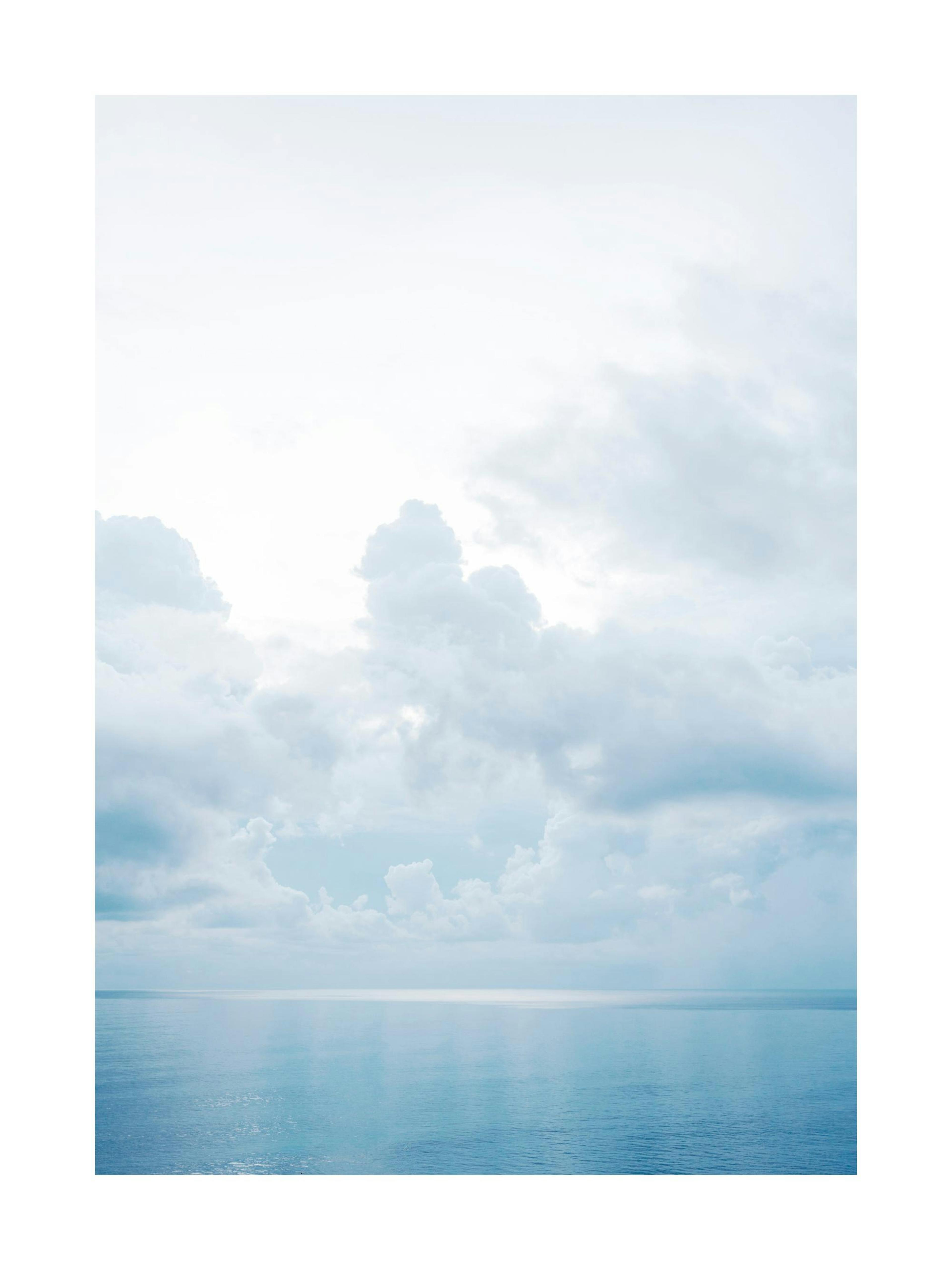 From £3.82A calm ocean poster with soft, rippling waves and fluffy clouds in white and grey. Light blue and white colours create a peaceful piece of wall art.
