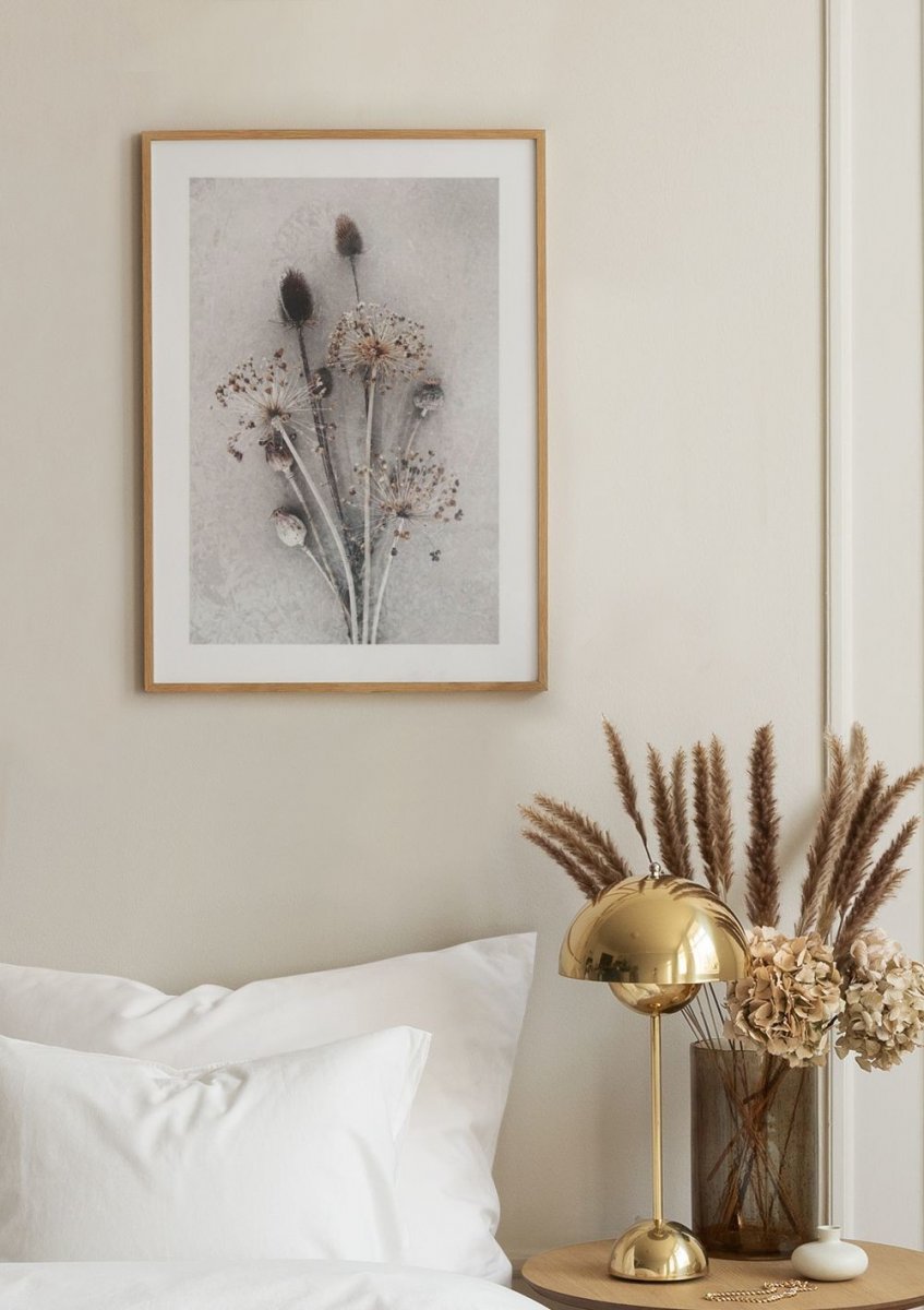A beautiful poster showing dried flowers with thin stems and round heads against a light background. The soft browns, beige and grey tones create a calming design.