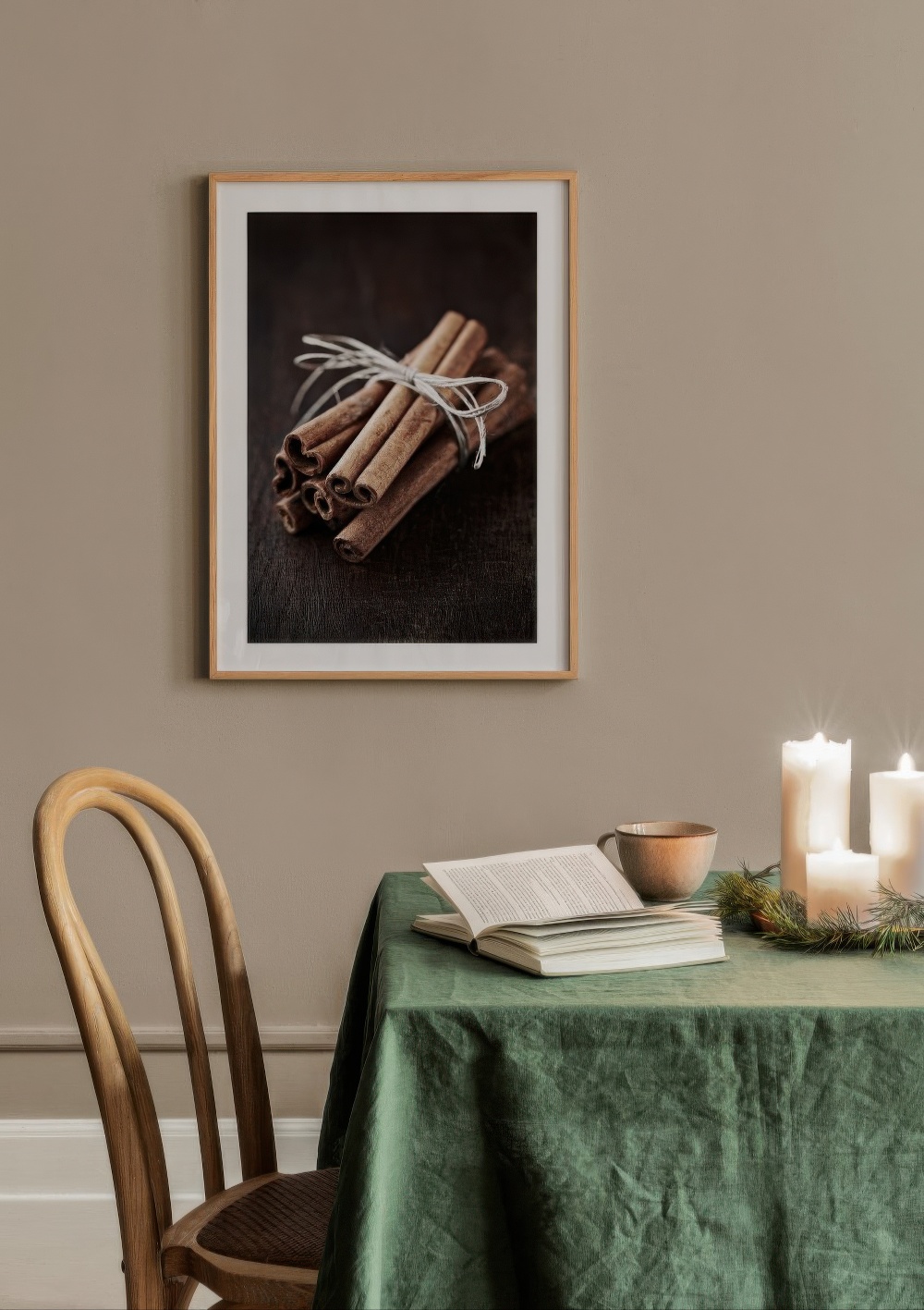 A photo poster with a photograph of brown cinnamon stick wrapped with a white bow. Smell the warm and sweet scent from the cinnamon and get your kitchen in the Christmas spirit! Combine this beautiful print with other winter inspired prints for a complete gallery wall.