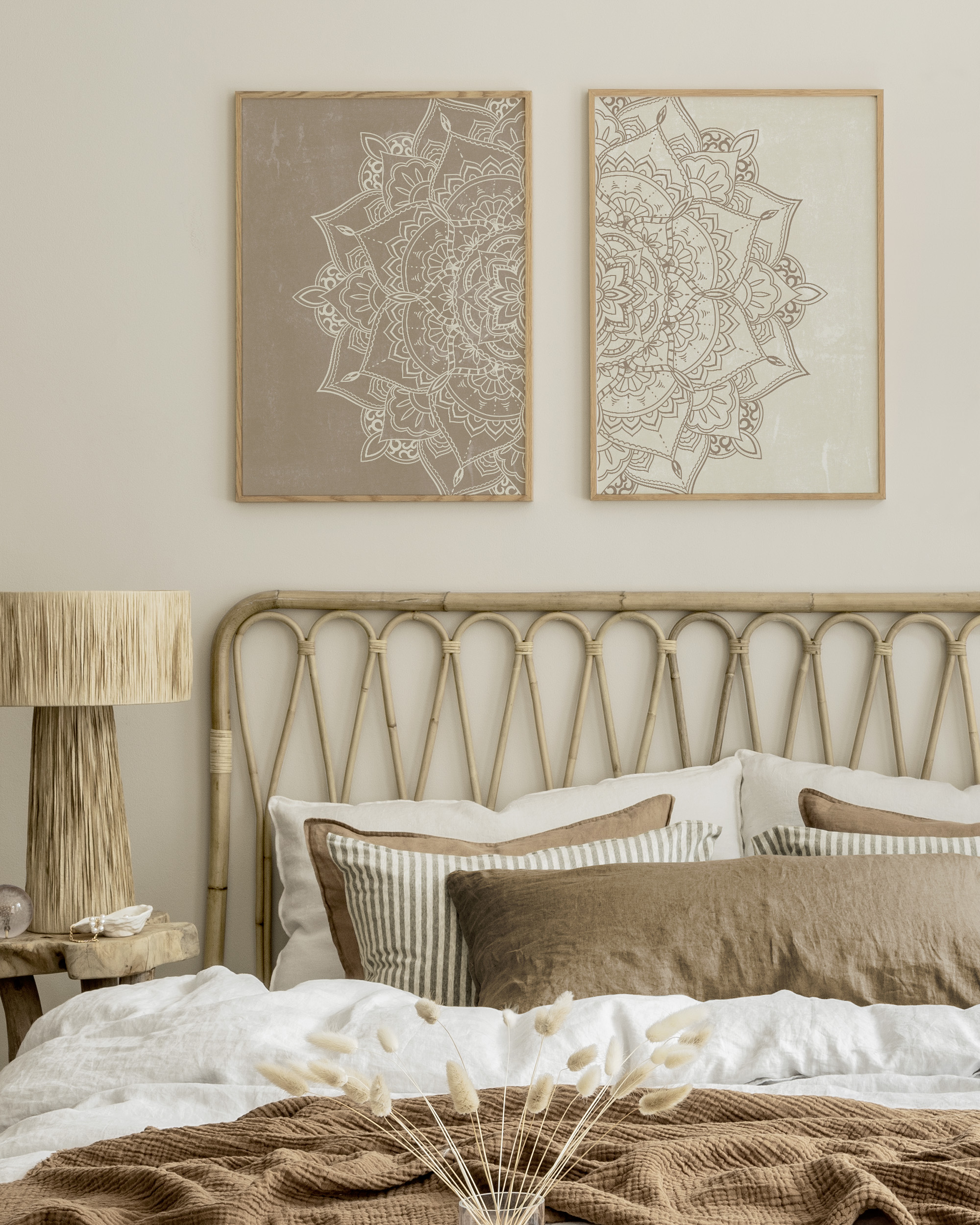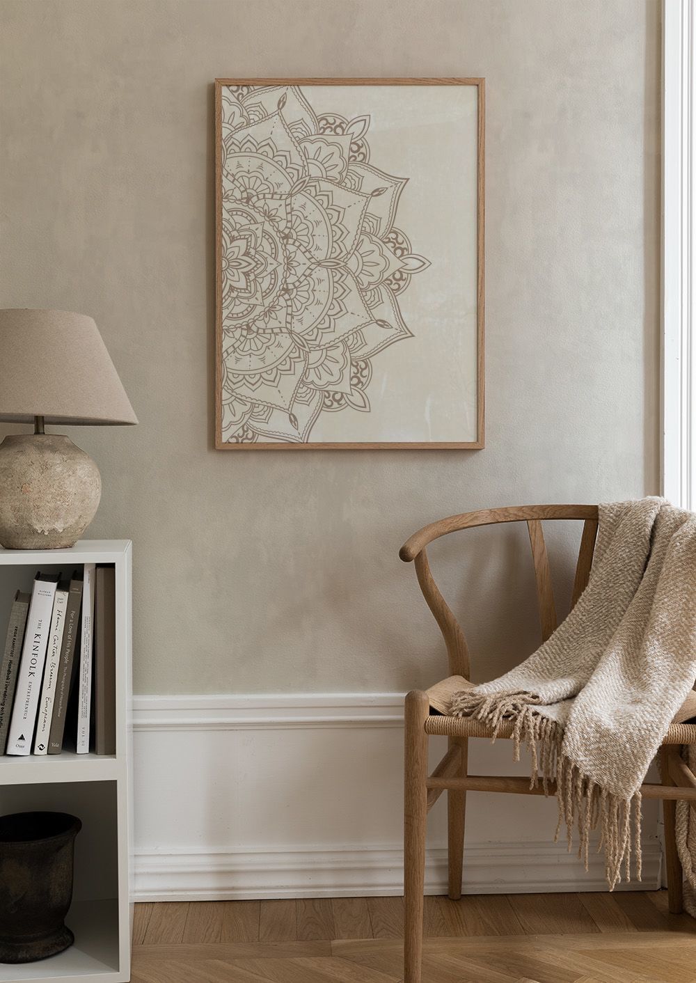A poster with a detailed mandala pattern in soft brown on a beige background. Perfect wall art for creating a calm atmosphere.