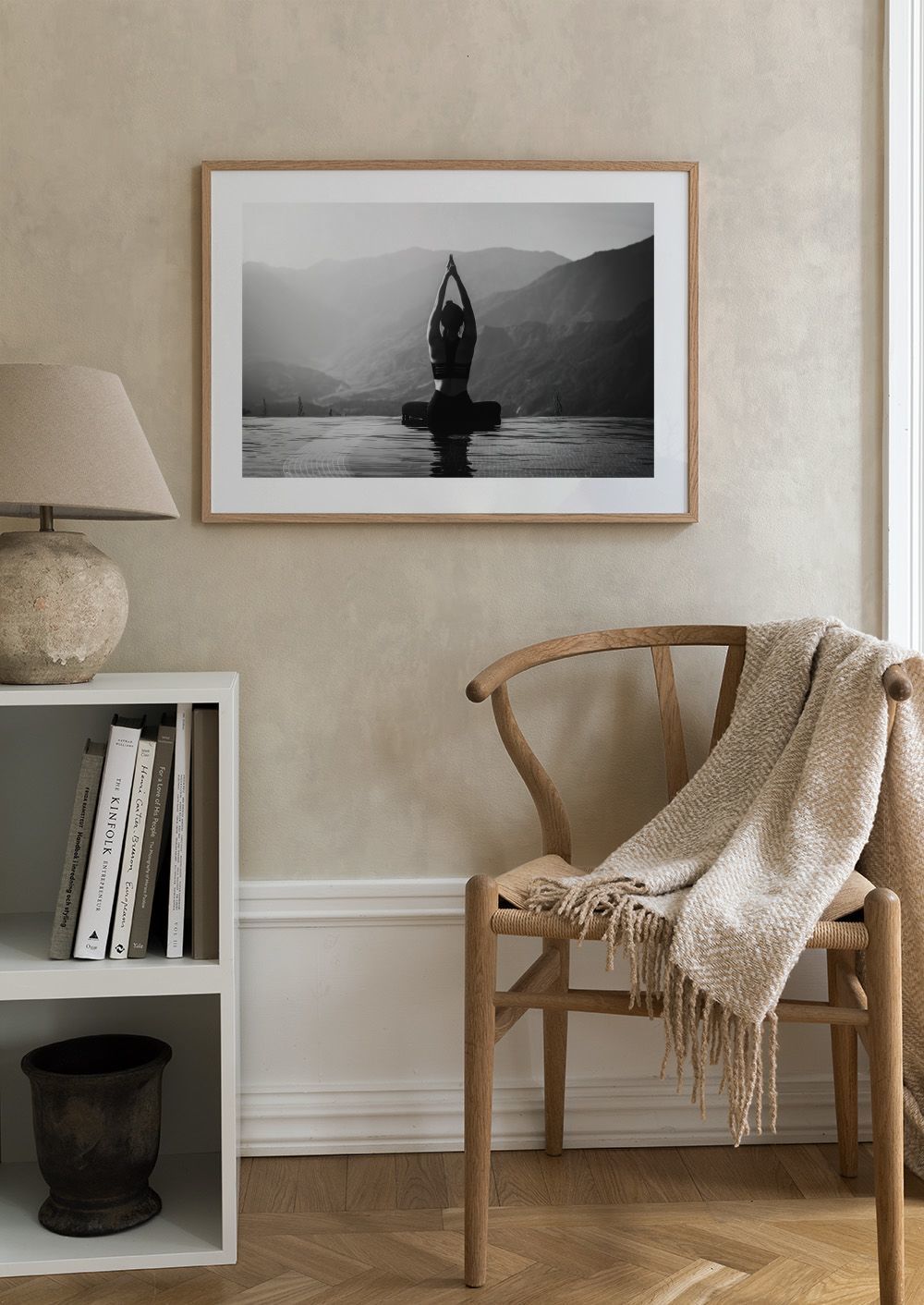 A black and white poster of a person in a yoga lotus pose on a calm water surface with mountains in the background.