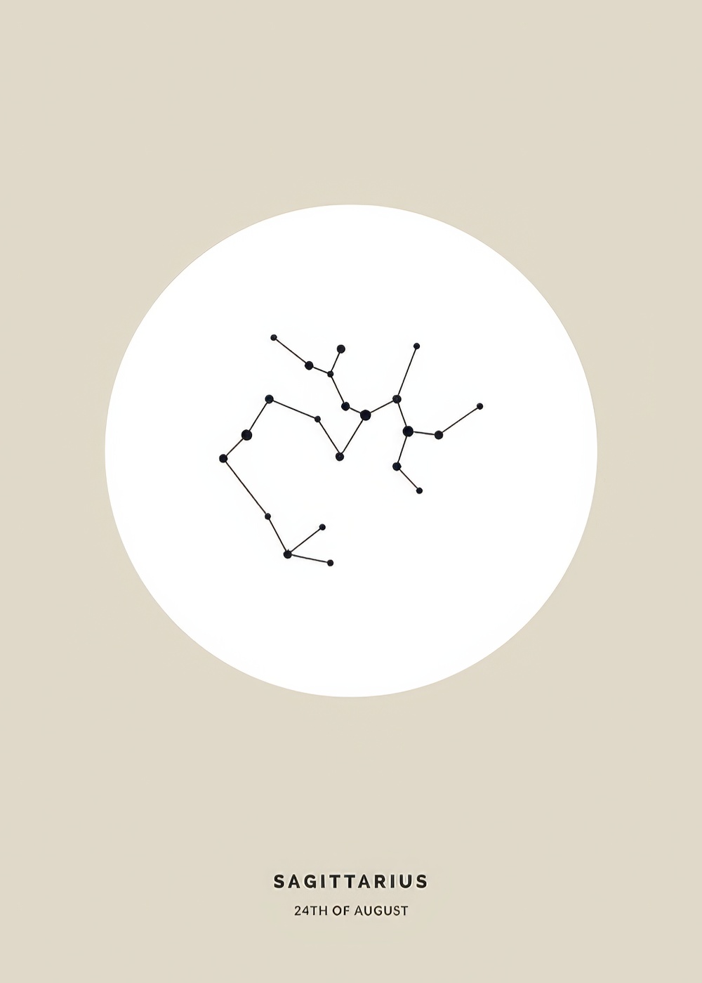From £8.37- Illustration of the zodiac sign for Sagittarius in black in a white circle on a beige background