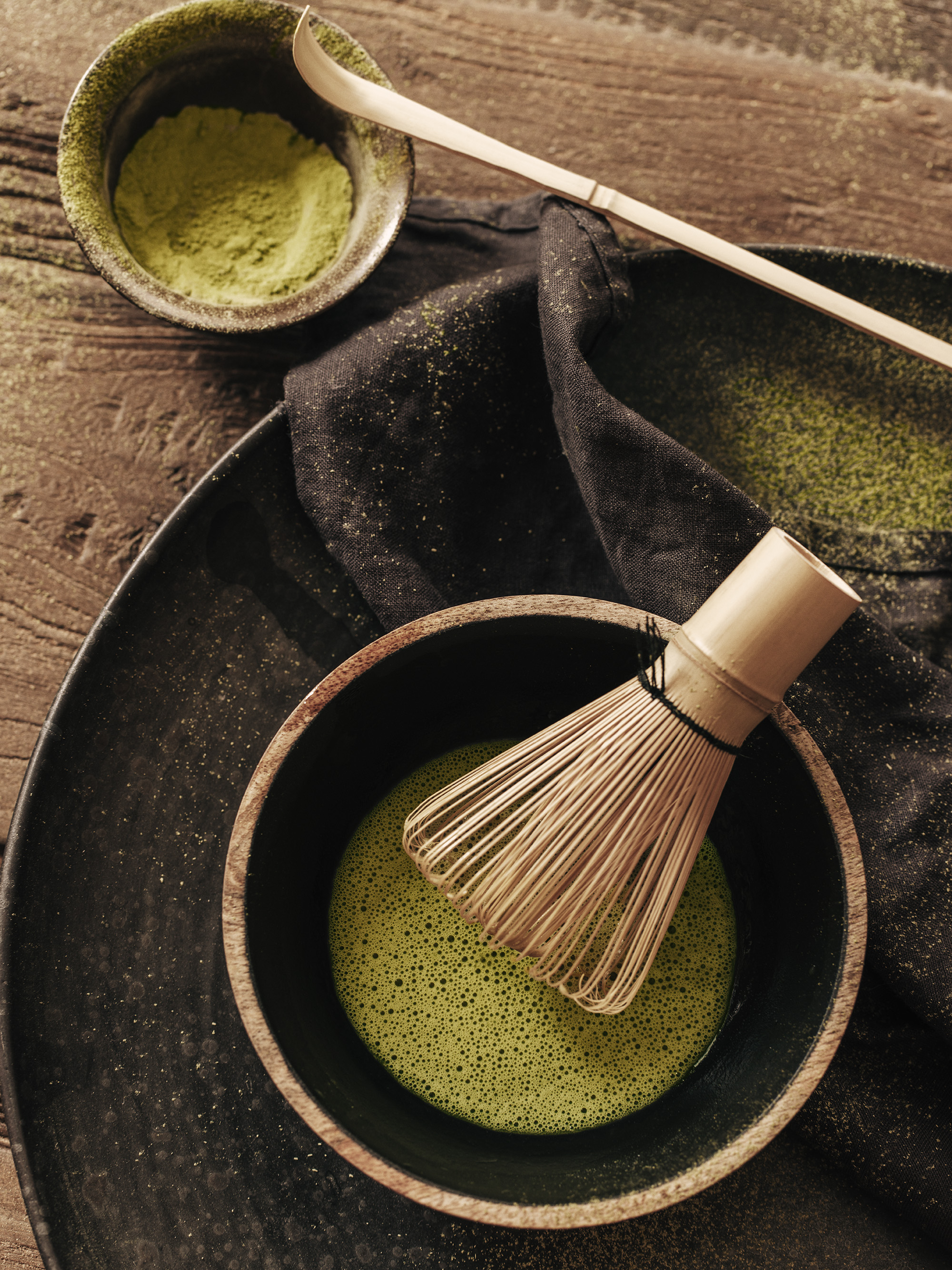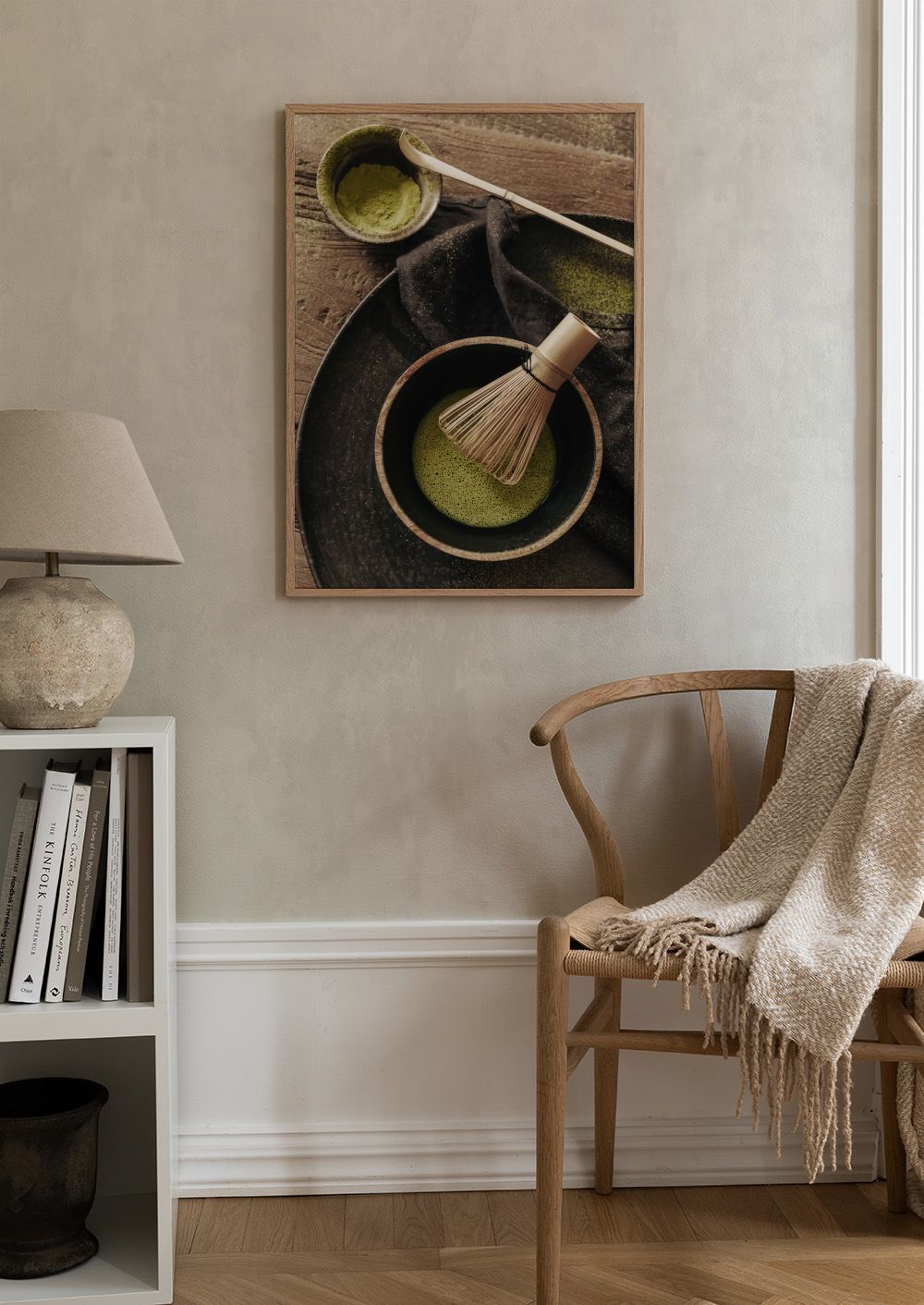 A poster of matcha tea in a black bowl with a bamboo whisk. Perfect wall art for tea lovers and fans of Japanese culture.