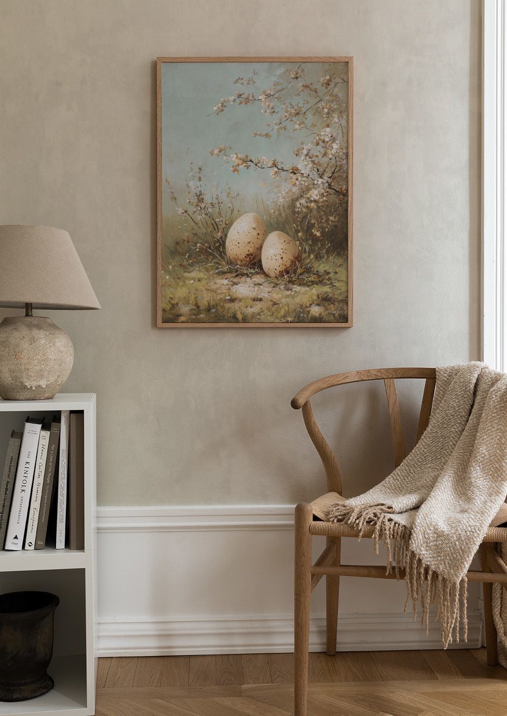 A poster illustrating two speckled Easter eggs resting on grass, surrounded by delicate branches with white and pink blossoms against a soft blue-green sky.